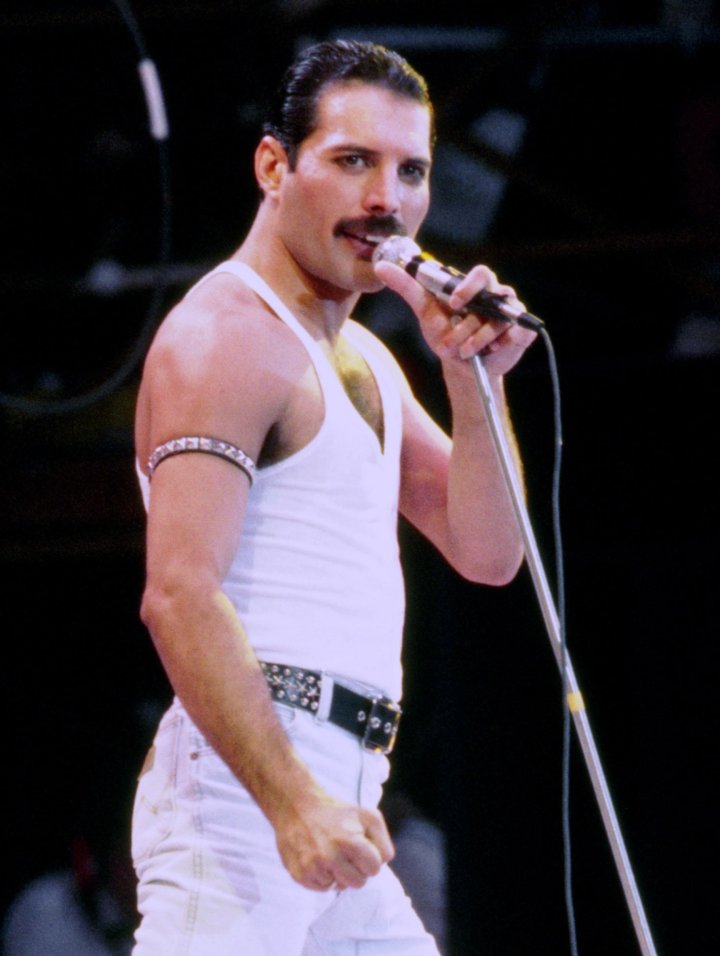 На знаменитом концерте Live Aid мы увидели самый извеcтный наряд певца — светло-голубые джинсы, простая белая майка, кеды и шипованные ремни на поясе и бицепсе.